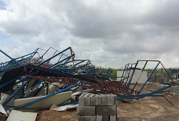 41年一遇的超强台风“威马逊”虽然已经消散,可它所到之处带来的威力却仍然让人心有余悸。总承包公司第六分公司钦州片区项目是这次超强台风灾害的重灾区,虽然台风来临前已做了相应的防范工作,可仍然难以抵御“威马逊”的肆虐,台风横扫过后,钦州学院项目部在建楼房的外架产生严重变形,有的楼房外架和井架发生倒塌,所有安全网基本损坏,1栋办公室、2栋宿舍倒塌,临时设施损坏严重,围墙倒塌,是钦州片项目中受灾最严重的项目,而其他几个项目的外架、临设、围墙、安全网等设施也严重损坏,现场遭受重创,一片狼藉,所有工地均停水停电,初步统计直接经济损失达600多万元,万幸的是,项目部认真按公司要求,事前采取了有效的防范措施,在这次风灾中没有人员伤亡及大型机械设备损坏。